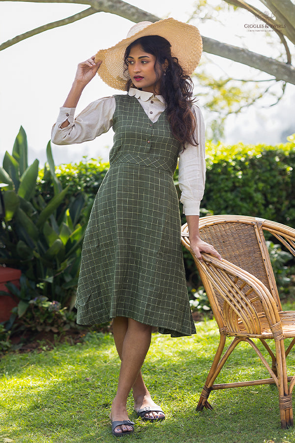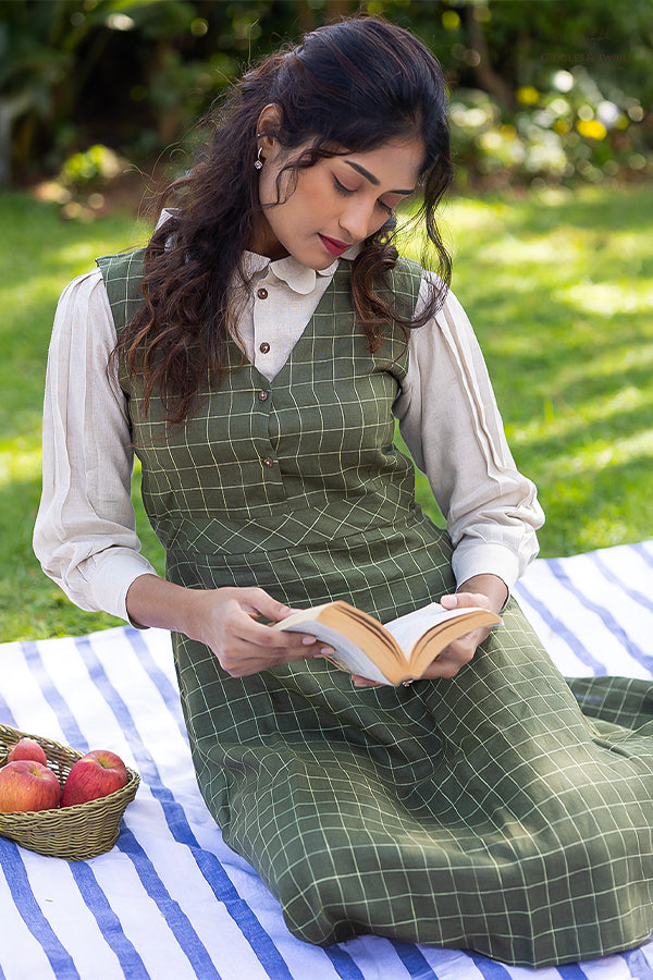 Crafted from breatheable linen in a classic forest green checkered pattern, paired over a soft beige button down shirt with subtle pleates on the sleeves. This ensemble captures a timeless, colonial era charm.