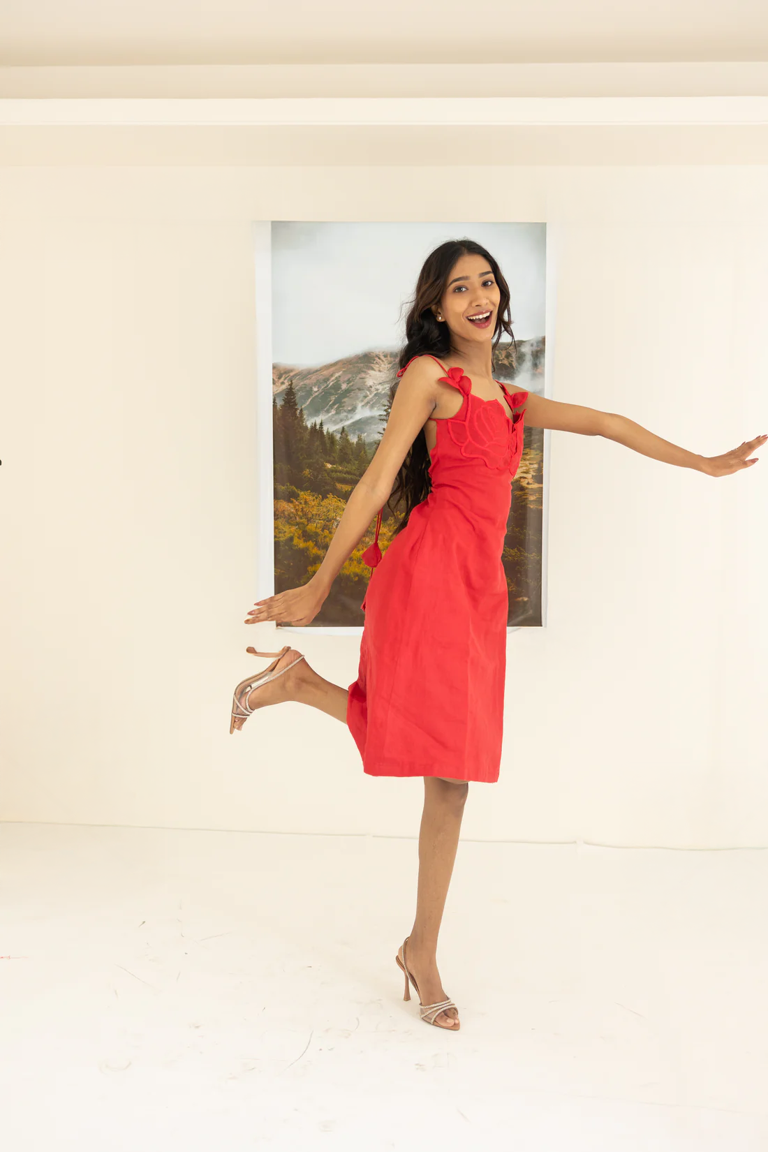 Designed with delicate rose detailing on the bodice and playful tassel ties on the sides, it blends elegance with fun. The soft shoulder ties and relaxed fit make it perfect for sunny days, brunches, or casual evenings.