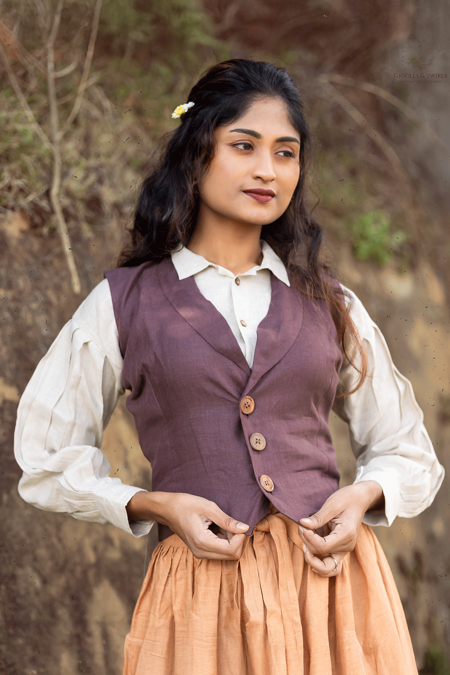 A sleeveless vest in a warm earthy tone-structured yet soft features classic V line wooden buttons adds a touch of rustic charm and layering versatility