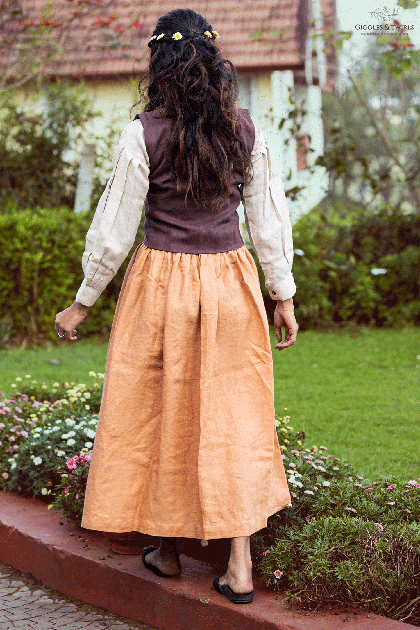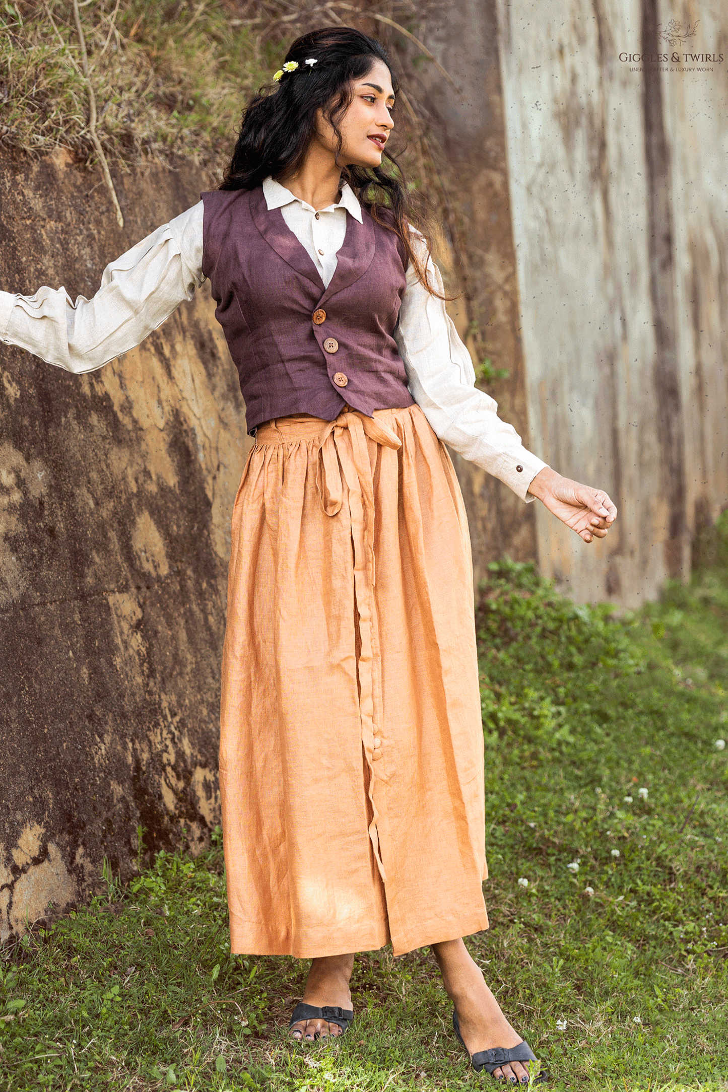 The warm ochre wrap skirt that drapes beautifully finished with detailing on the centre and fabric buttons adds quiet charm & movements