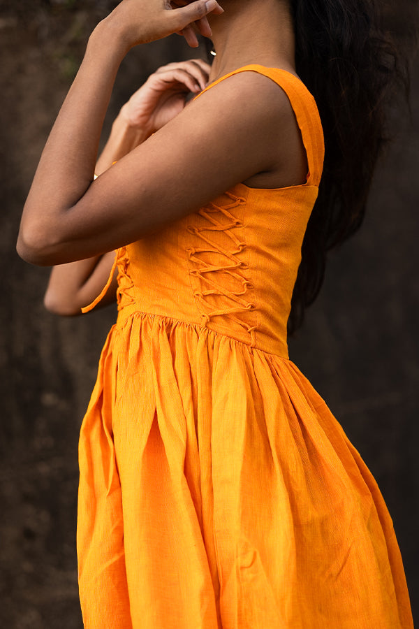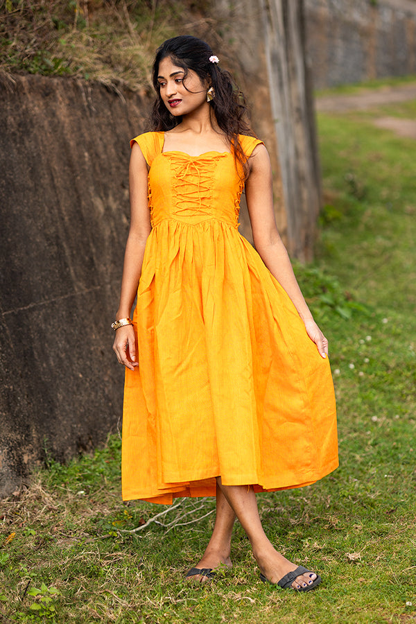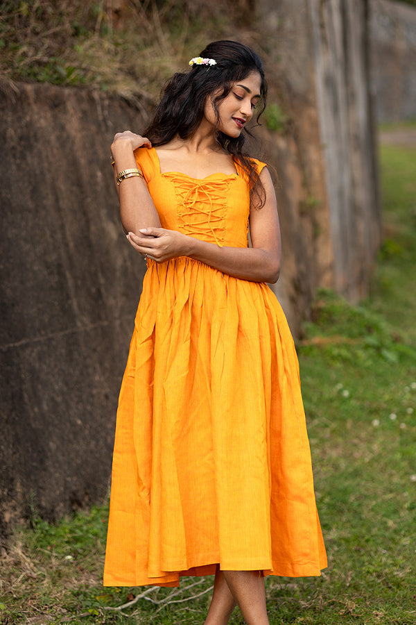 A breezy mustard linen dress with a Lace-up front and on the sides and flared skirt makes it lightweight, breathable and perfect for sunny days.